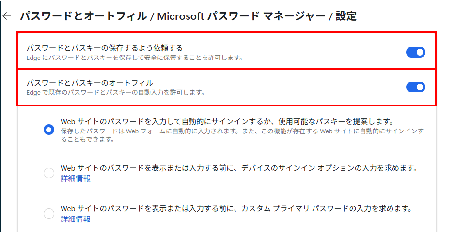 画面右側の「パスワードとパスキーを保存するか確認する」をオン