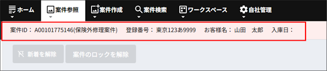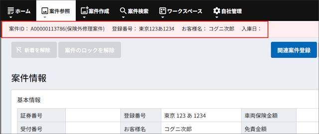 保険外修理案件は画面上部にピンク色の帯で案件IDの右に「保険外修理案件」と表示されます。