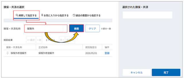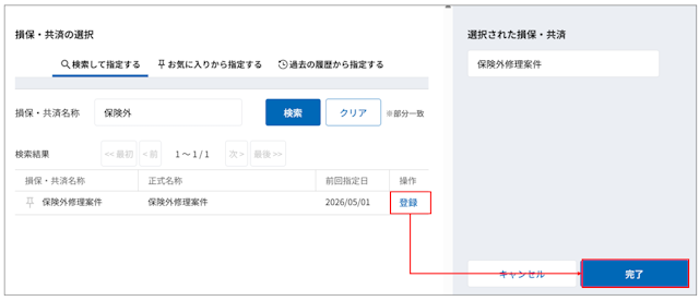 4.検索結果に表示された「保険外修理案件」の右の「登録」を選択し、[完了]を選択します。