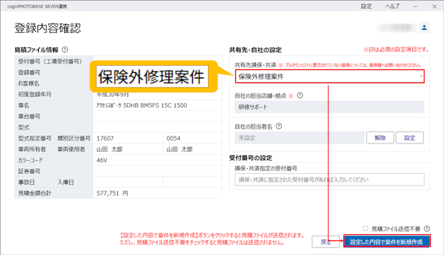1.【登録内容確認】の「共有先損保・共済」で「保険外修理案件」を選択し、[設定した内容で案件を新規作成]を選択します。