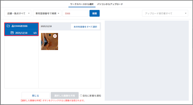 左側に登録番号とワークスペースへ送信した日付のフォルダが表示されるかご確認ください。