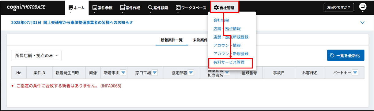 1.【自社管理】ー「有料サービス管理」を選択します。