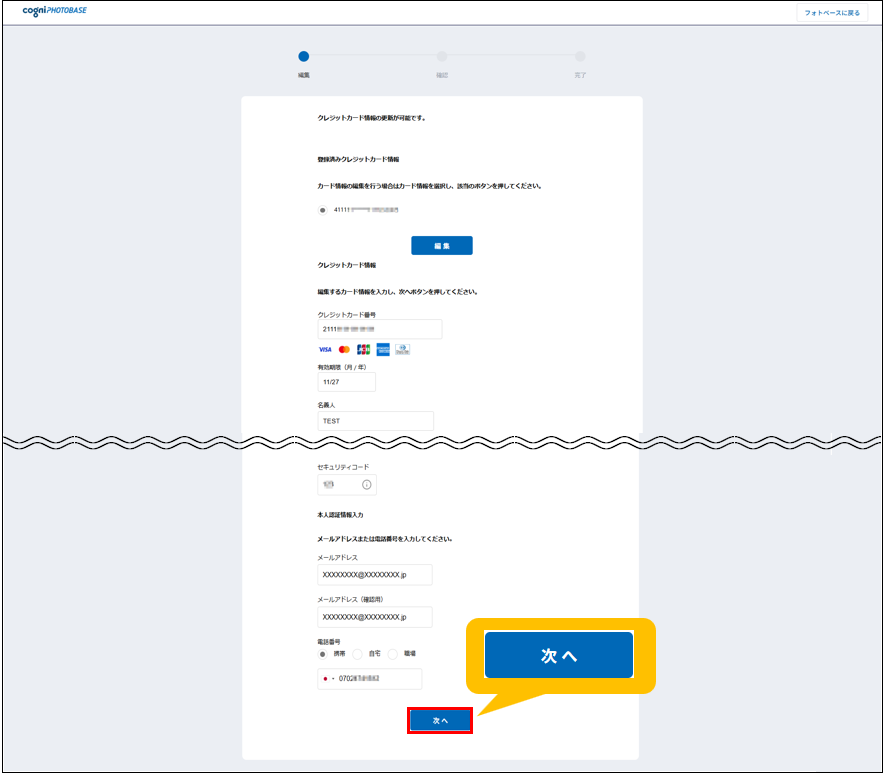 4.登録するクレジットカード情報を入力し、[次へ]ボタンをクリックします。
