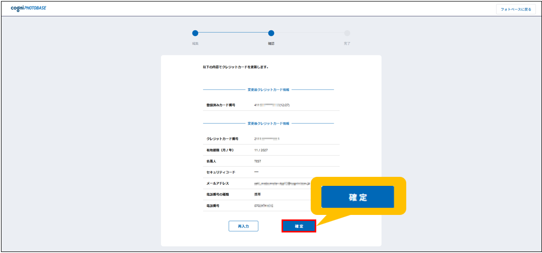 5.変更後のクレジットカード情報を確認し、問題がなければ[確定]ボタンをクリックします。