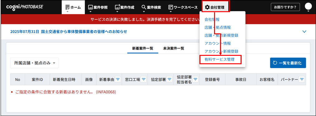 有料サービスの自動決済に失敗した場合は、メールで通知するとともに画面上部にも決済失敗の旨が表示されます。