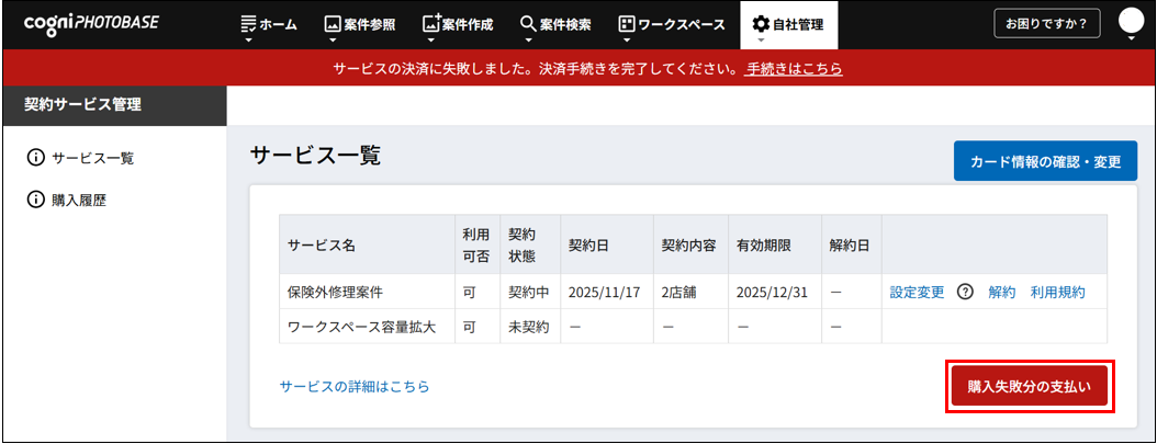 - ※ワークスペース容量拡大サービスのみご契約の場合は、2回連続で自動決済が失敗すると利用できなくなります。