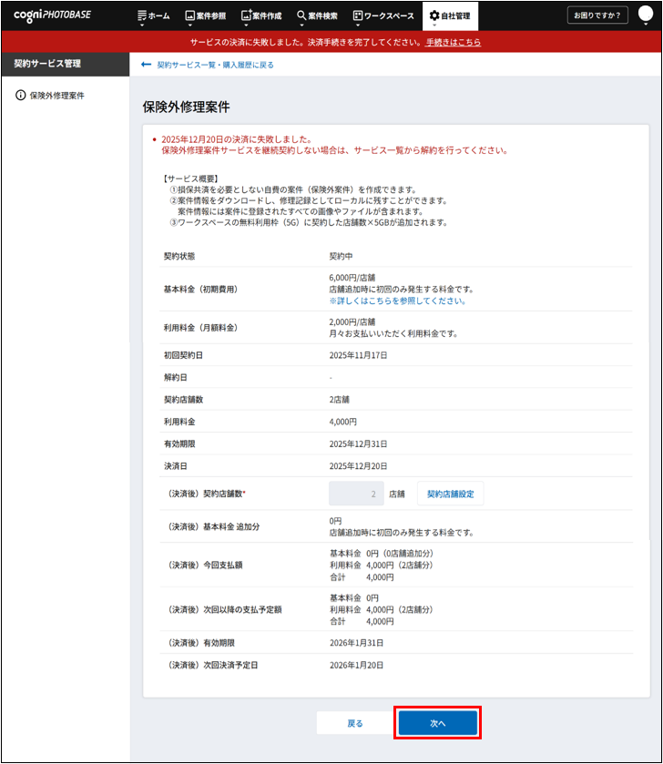 ※変更された項目は背景が黄色で表示されます。※保険外修理案件サービスの未払金を決済に失敗した月の翌月以降にお支払いいただく場合は、再契約となり「基本料 × 利用店舗数」が発生します。