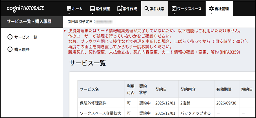 決済の途中で画面を閉じる、またはブラウザの「戻る」ボタンで戻ると「有料サービス管理」画面で以下のエラーメッセージが表示されます。
