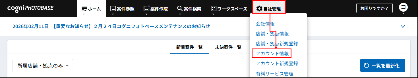 1.【自社管理】-「アカウント情報」を選択します。