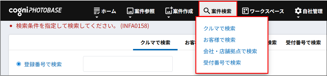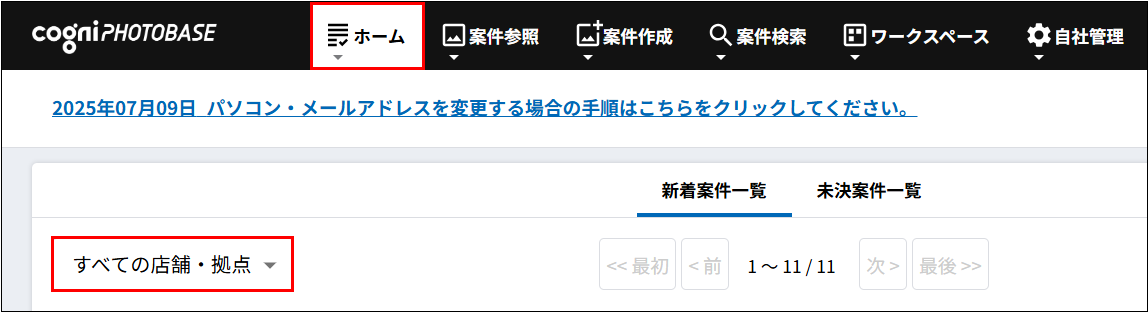 【ホーム】の案件一覧画面左上のプルダウンで「すべての店舗・拠点」を選択するか(図1)、【案件検索】機能をご利用ください。(図2)