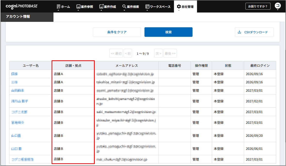 店舗・拠点欄で、廃止予定の店舗に所属しているアカウントがないことを確認します。
